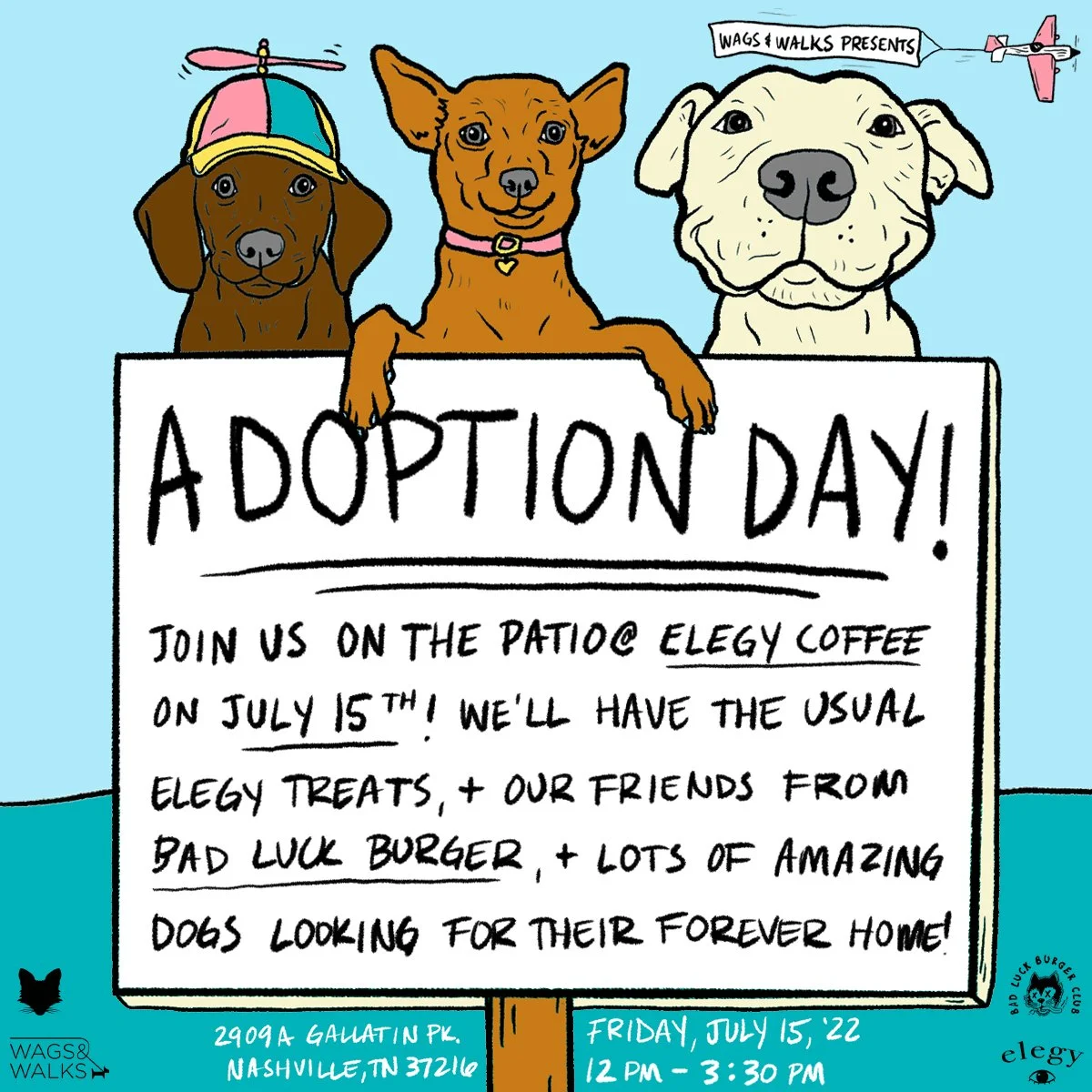 From our friends at Elegy Coffee, “🐶SAVE THE DATE🐶 it’s no secret we love dogs A LOT over here, but we also love all the amazing things @wagsandwalksnashville does for them day in & day out❤️ Come hang with us & some perfect pups looking for their fur-ever homes on Friday July 15 & enjoy a delicious burger from our besties @badluckburgerclub while you’re at it!”